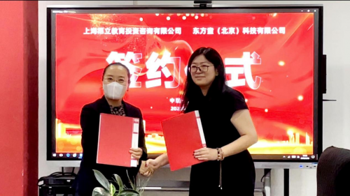 東方童(北京)科技有限公司文化傳媒事業部總經理尹健穎、上海昂立教育投資咨詢有限公司研學項目負責人金玫伶舉行簽約儀式