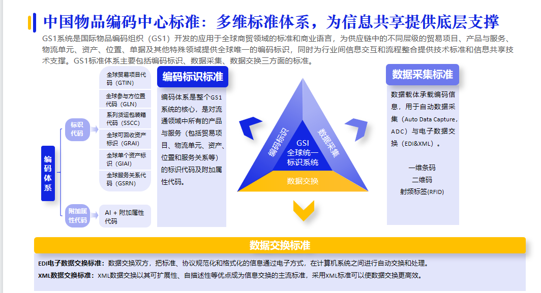 統(tǒng)一物品編碼標準一直是采購供應鏈領(lǐng)域的重點和難點。中國物品編碼中心的GS1系統(tǒng)是國際物品編碼組織(GS1)開發(fā)的應用于全球商貿(mào)領(lǐng)域的標準和商業(yè)語言,為供應鏈中的不同層級的貿(mào)易項目、產(chǎn)品與服務、物流單元、資產(chǎn)、位置、單據(jù)及其他特殊領(lǐng)域提供全球唯一的編碼標識,同時為行業(yè)間信息交互和流程整合提供技術(shù)標準和信息共享技術(shù)支撐。