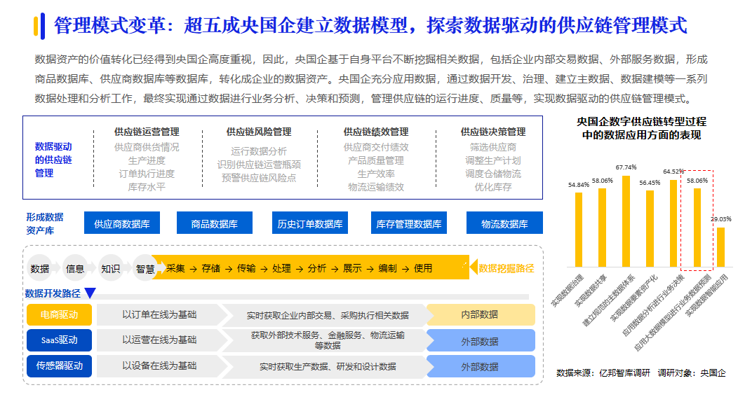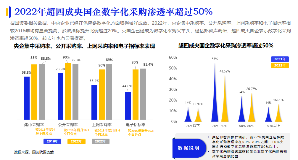 央國企在我國企業(yè)采購數(shù)字化進程中的火車頭效應越發(fā)明顯。據(jù)億邦智庫調(diào)研,超四成央國企表示數(shù)字化采購滲透率已經(jīng)超過50%;形成了央國企先行,引發(fā)供應鏈各環(huán)節(jié)企業(yè)參與數(shù)字化創(chuàng)新變革的發(fā)展態(tài)勢。