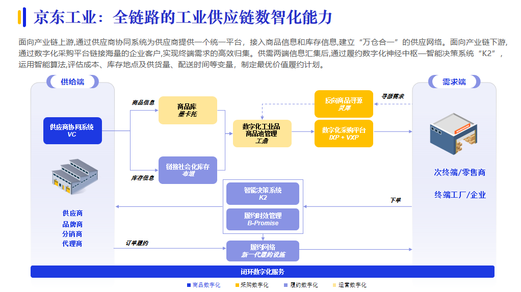 數(shù)字供應鏈發(fā)展已經(jīng)從關(guān)注部分環(huán)節(jié)、部分參與者,轉(zhuǎn)向關(guān)注全鏈條、生態(tài),因此,全鏈路數(shù)智供應鏈解決方案漸成主流。例如,京東工業(yè)面向產(chǎn)業(yè)鏈上下游,通過供應商協(xié)同系統(tǒng)建立“萬倉合一”的供應網(wǎng)絡;通過數(shù)字化采購平臺實現(xiàn)終端需求的高效歸集,再通過智能決策系統(tǒng)“K2”,制定最優(yōu)價值履約計劃。