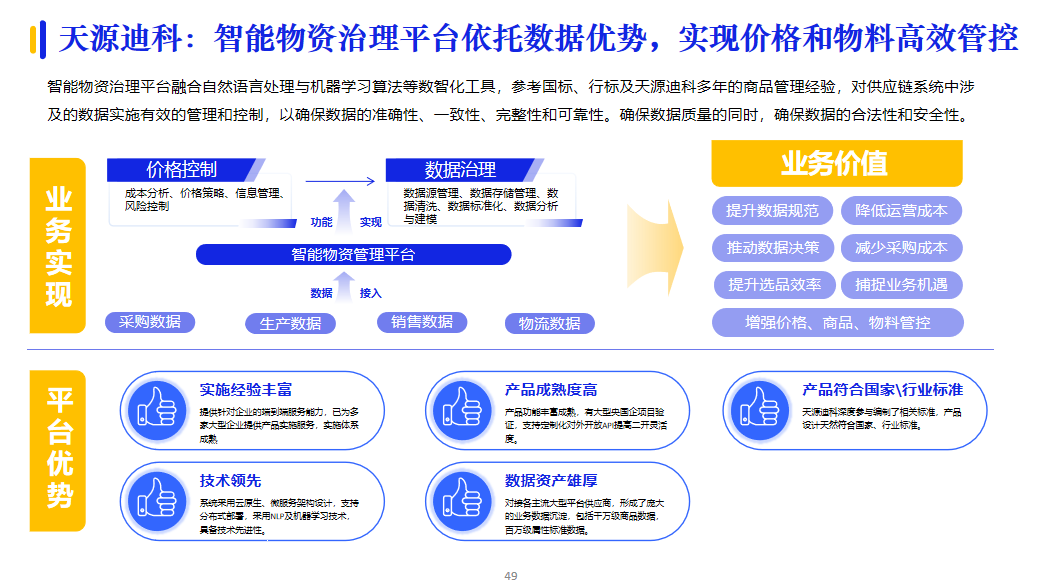 部分央國企會根據(jù)企業(yè)自身的數(shù)字化薄弱點,采取有針對性地補齊斷點的實施策略,包括供建立應商協(xié)同管理系統(tǒng)、優(yōu)化物資分類與編碼設計、建立供應商管理體系、建設電商采購平臺、設計倉儲管理體系等內(nèi)容。例如:天源迪科在智能物資治理方面,提出了價格和物料高效管控的解決方案,有效確保價格數(shù)據(jù)的合法性和安全性。
