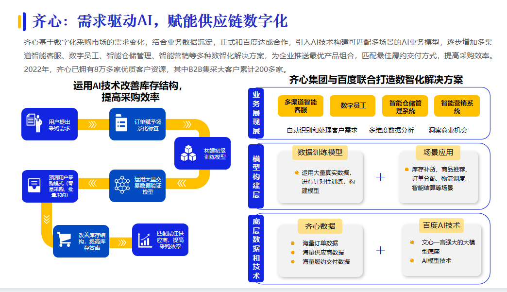 今年還有不少供應商在數(shù)字供應鏈建設方面,推出升級的智能化服務。比如,齊心引入AI技術(shù)構(gòu)建可匹配多場景的AI業(yè)務模型,為企業(yè)匹配最佳履約交付方式。