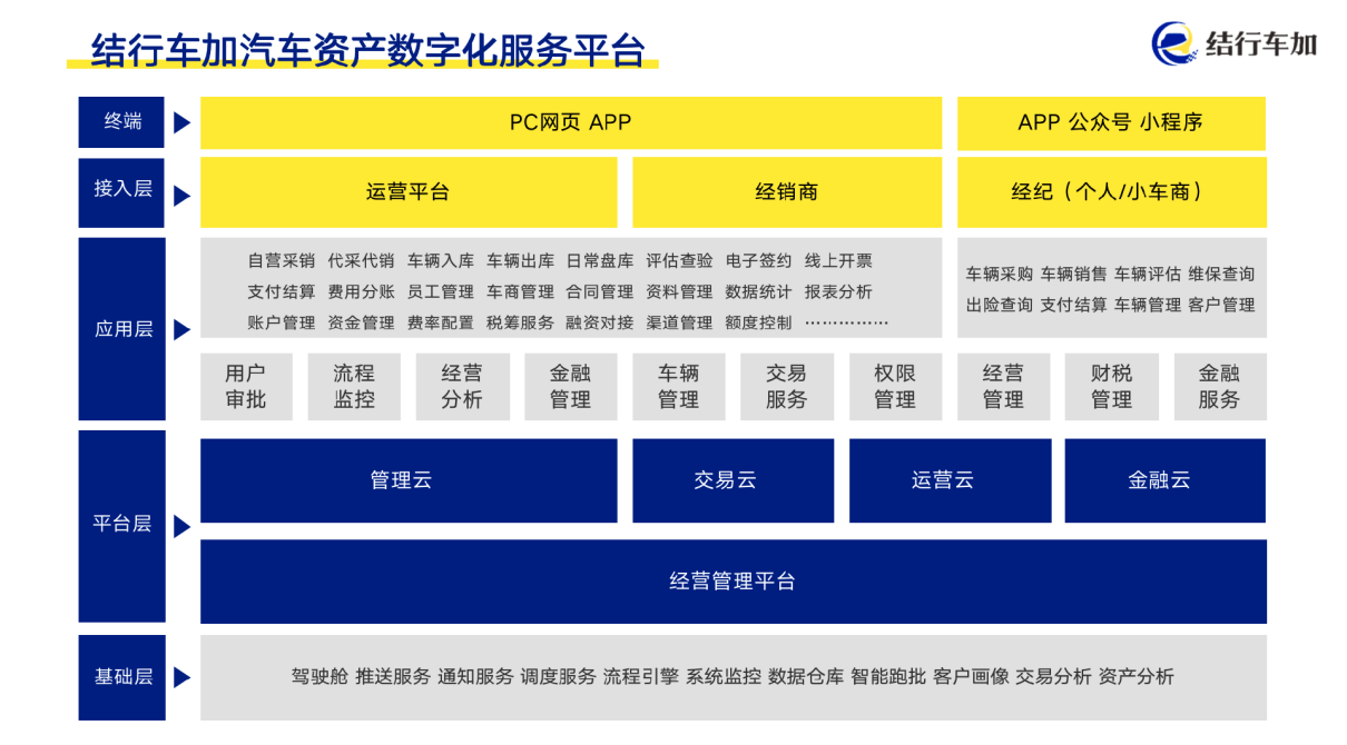 結行車加汽車資產數字化服務平臺包含數智管理、數智運營、數智服務、數智金融四大功能,能為客戶提供聯合采購、財稅管理、報表管理、金融服務、風控審批以及車輛評估、維保查詢、線上開票等實用增值服務,可為二手車交易從業者搭建標準化、線上化、數字化、智能化基礎設施,快速提升車企經營水平,實現降本增效、優化資源配置。