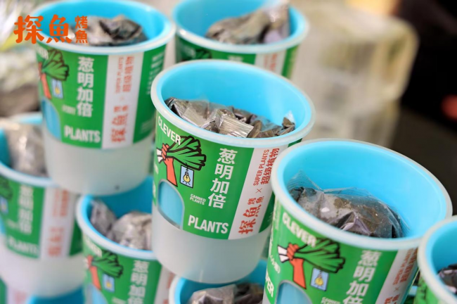 在產品研發上,探魚也充分考慮了顧客在感官、味覺、互動等多方面的場景體驗,最新推出的“鮮青椒蔥蔥烤魚”就充分體現了這一點。鮮青椒蔥蔥烤魚在創新理念上,是探魚招牌口味“鮮青椒爽麻烤魚”口味的味型升級,在藤椒口味的基礎上增加時令性的蔥香風味,一經推出,就頗受大眾喜愛。據悉,新品上市7天,已經比去年同期上新的烤魚銷量上漲105%。在產品呈現上,新品上餐時配上一整棵鮮甜大蔥,然后由服務人員現場進行“剪蔥儀式”,將蔥段下入鍋內,提味增香,同時為消費者營造一種新奇特的體驗感。除此之外,探魚借勢本次上新,與最近大熱的植物品牌“超級植物公司”聯名推出可以種出小蔥的“蔥明種子卡”,不僅深化蔥的產品主題,還收獲了目標客群“打工人”的情感共鳴。