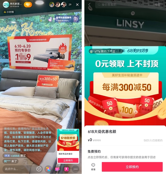 為此,在大促期間,林氏家居特意通過凸顯活動優惠的多種物料增加直播間大促氛圍 ,利用一目了然的優惠信息吸引用戶駐足,借助包括商品介紹、稀缺性優惠劵推介等標準化、模塊化的直播話術,強調活動優惠信息,加速產品種草,引導用戶領取優惠進行留資,線下到店購買商品。