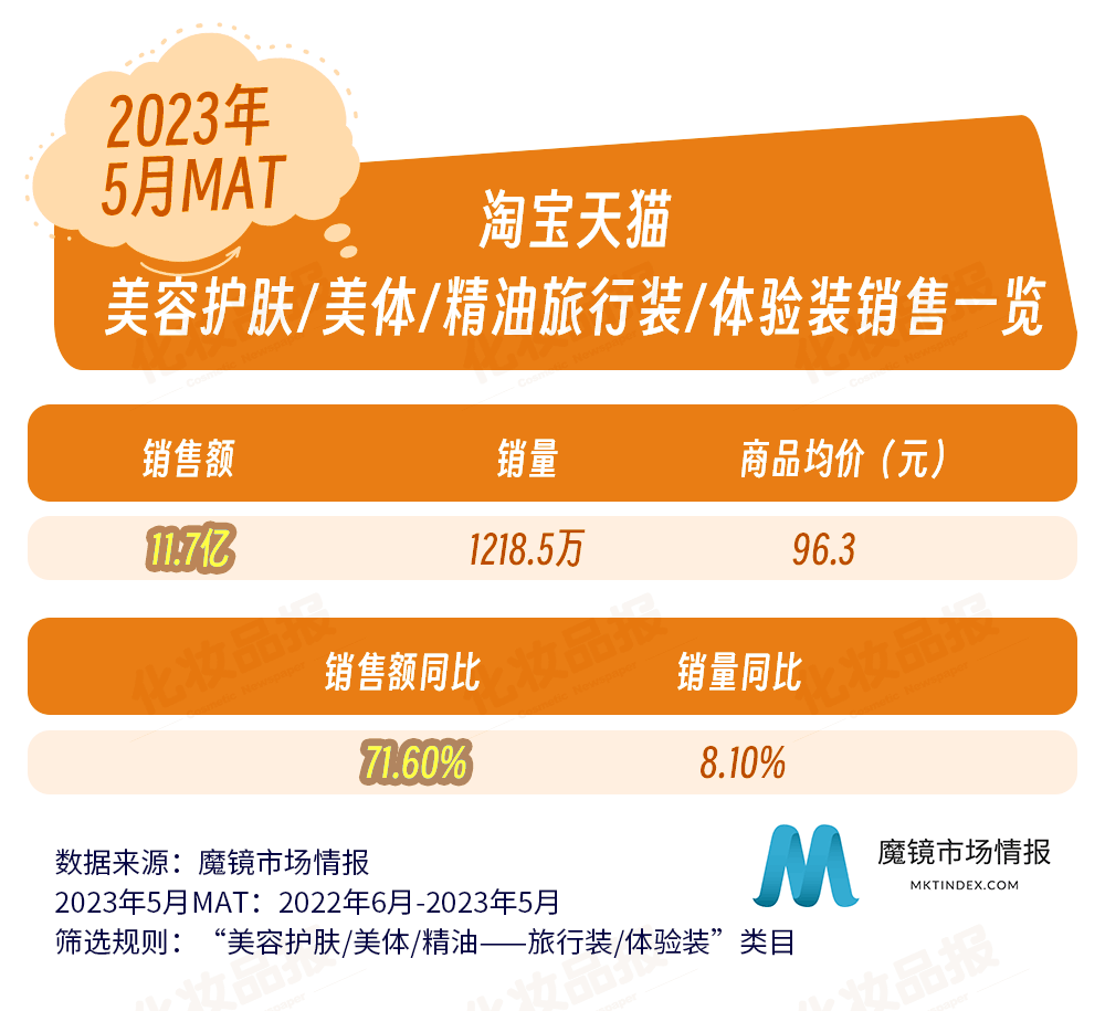 近日,國內零售洞察公司魔鏡市場情報發布了一份關于化妝品旅行裝/體驗裝在各主流電商平臺的銷售調研報告。報告統計的類目主要針對彩妝、香水、美妝工具、美容護膚、美體和精油類旅行裝/體驗裝,統計調查的平臺涵蓋淘寶、天貓、抖音等,統計周期為2022年6月-2023年5月。
