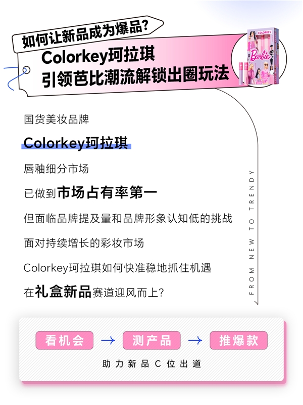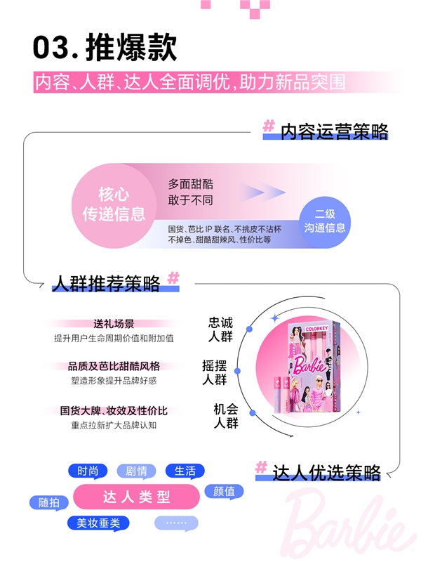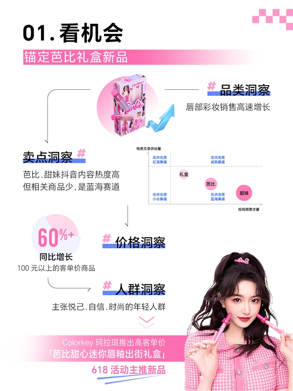 適用于送禮、提升品牌調性、具有高客單價特征的“芭比禮盒”新品,符合品牌風格特點和消費需求,適宜作為品牌形象款進行主推和破圈。基于此,珂拉琪打造高客單價“芭比甜心迷你唇釉出街禮盒”作為618活動的主推新品,強力吸引目標人群。