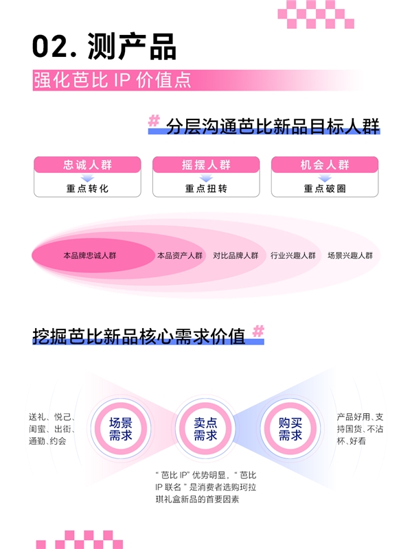 2、分關系人群:針對忠誠人群強調送禮場景,針對搖擺人群強調品質及芭比風格,針對機會人群強調妝效及性價比。