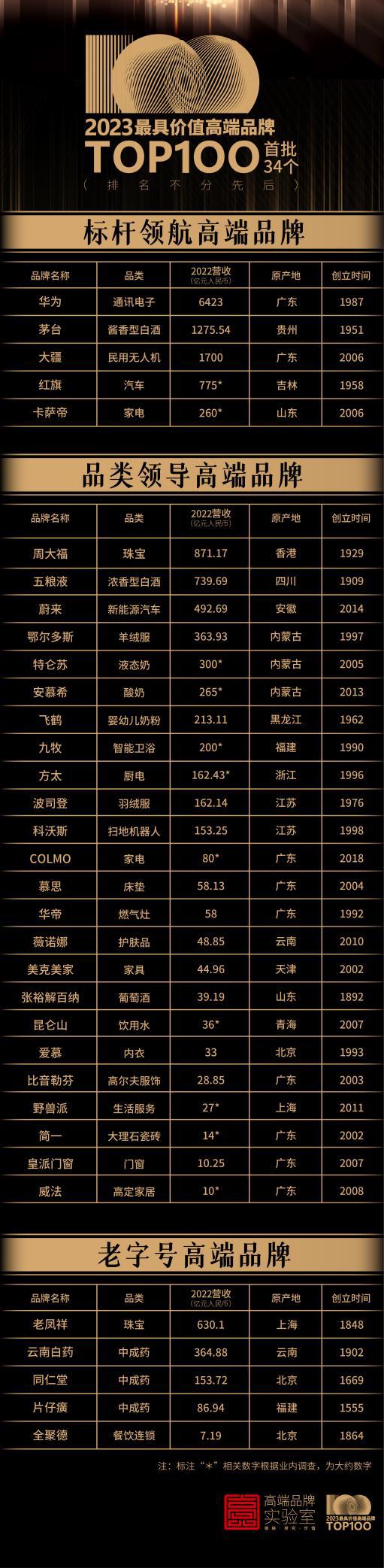 5月11日,由中國公務航空集團獨家冠名的“2023最具價值高端品牌TOP100”榜單正式發布。這份號稱“國內首家”的榜單上,茅臺、華為、卡薩帝、紅旗、慕思、飛鶴等34個品牌進入了TOP100首批名單。