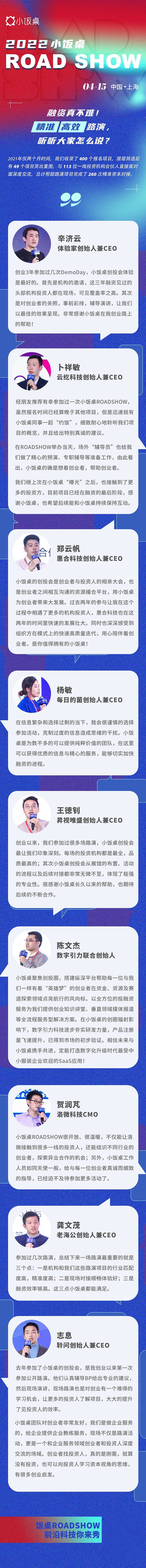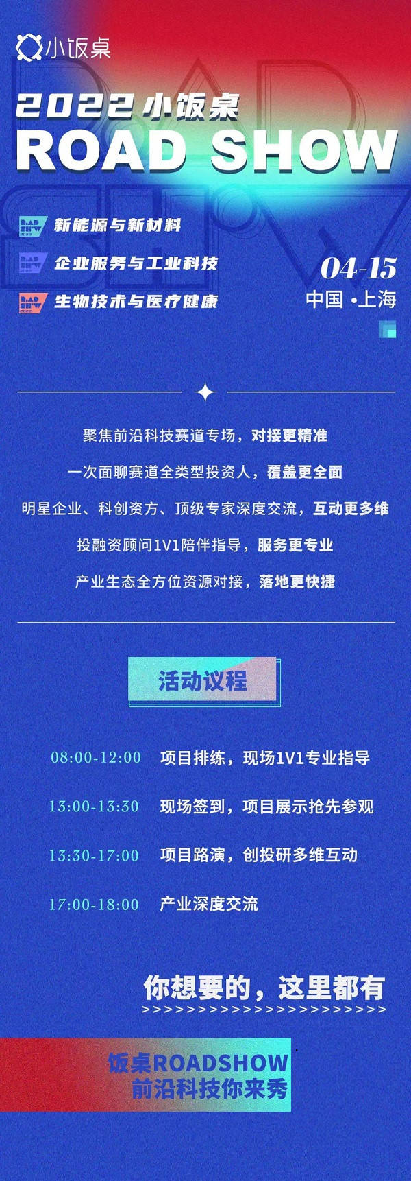 導語:4月15日,2022小飯桌ROASHOW將登陸上海,將開設“新能源與新材料”、“企業服務與工業科技”、“生物技術與醫療健康”賽道專場路演,歡迎各位優秀的科技創業者前來應戰!