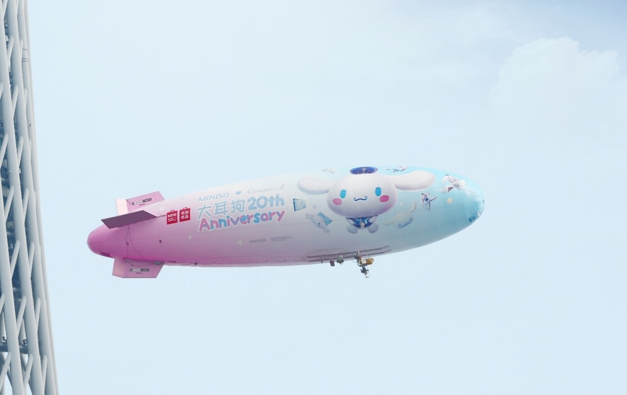 在“大耳狗20周年”期間,名創(chuàng)優(yōu)品于3月19日當(dāng)天獨(dú)家打造了一架豪華飛艇,把“大耳狗寵上天”。這架飛艇圍繞廣州塔、海心橋、獵德大橋環(huán)繞飛行,從下往上看飛艇的外觀,正是大耳狗20周年慶主題海報(bào)。隨著飛艇乘風(fēng)而上,大耳狗仿佛躲進(jìn)輕紗包裹般的云端里,沖著地面的人打趣逗樂(lè)。