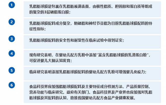 專家組參考自1965年至2022年期間的相關文獻,通過專題討論形式,達成了6項共識性觀點和建議,其中包括乳脂肪球膜配料的安全性和耐受性在臨床試驗中得到證實;現有研究表明添加乳脂肪球膜配料及磷脂的嬰幼兒配方乳粉可促進嬰兒大腦認知發育;臨床研究表明添加乳脂肪球膜配料的嬰幼兒配方乳粉可增強嬰兒免疫力;食品科技界應加強乳脂肪球膜配料及主要特征成分檢測方法、產品質量控制、營養功能與臨床研究。政府部門、食品科技界及產業界也應加強對乳脂肪球膜及其配料的認知,助推我國嬰幼兒配方食品產業健康發展等。