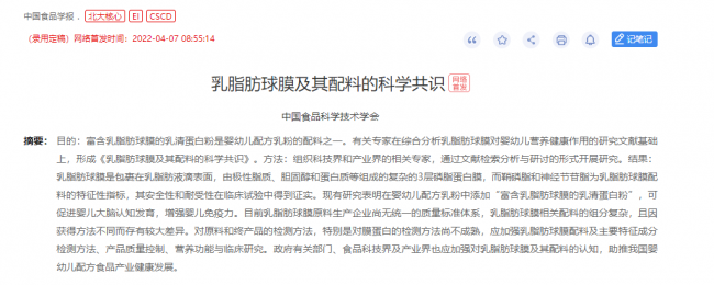 4月7日,《中國食品學報》刊發中國食品學界剛剛取得的一個突破性科學共識成果——中國工程院院士、中國農業大學營養與健康研究院院長任發政等近20位中國食品科學技術學會權威專家形成了國內首個《乳脂肪球膜及其配料的科學共識》(以下簡稱“乳脂肪球膜科學共識”),共識明確指出,嬰幼兒配方乳粉添加“富含乳脂肪球膜的乳清蛋白粉”后可促進嬰兒大腦認知發育、增強嬰兒免疫力。
