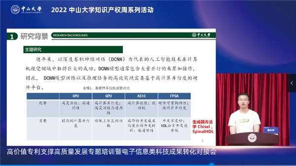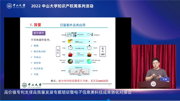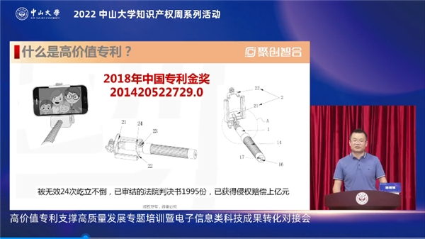 2022年4月28日,在中山大學的全程指導及越秀區政府的鼎力支持下,中山大學科學研究院、廣州高新區黃花崗科技園管委會、中山大學圖書館、廣州中大知識產權服務有限公司共同成功主辦中山大學知識產權周系列活動高價值專利支撐高質量發展專題培訓暨電子信息類科技成果轉化對接會。本次活動采取線上方式開展,邀請兩位業界專家圍繞高價值專利支撐高質量發展做專題報告,多達178項電子信息類專利項目與83家企業進行了精準對接,活動在線人數超2.2萬人,多位知識產權專家及知名企業在云端匯聚,助力知識產權高質量發展。