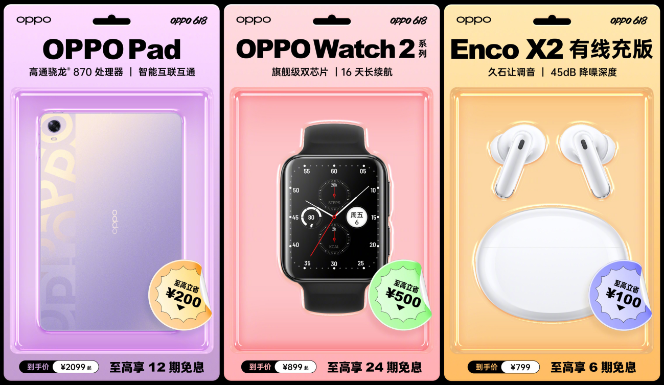 除了以上各款智能手機以外,OPPO豐富的IoT產品也擁有不同程度的優惠,搭載驍龍870處理器的OPPO Pad平板電腦至高立省200,到手價僅2099元起;OPPO Watch 2系列至高立省500,到手價899元起,還可享24期免息;真無線藍牙耳機OPPO Enco Air2 Pro至高立省50元,僅需249即可入手。