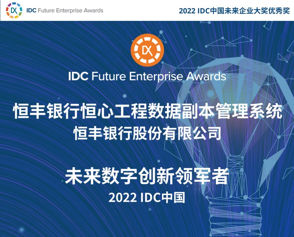 9月1日,IDC中國正式發布2022IDC中國未來企業大獎優秀案例獲獎名單,恒豐銀行憑借恒心工程數據副本管理系統項目獲評“未來數字創新領軍者”優秀獎。