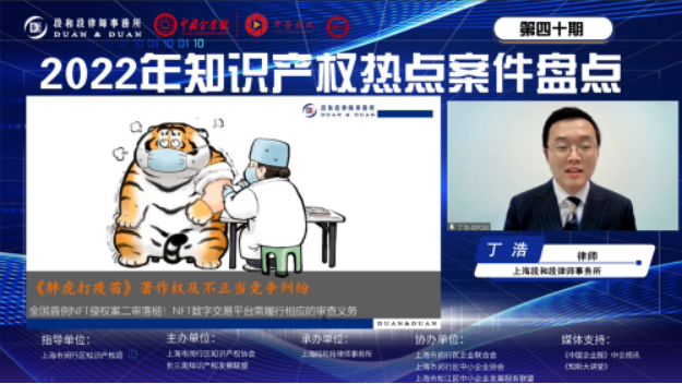 尊重和保護知識產權方得始終 丁浩盤點并解讀了2022年著作權及商標熱點案例,重點介紹了全國首例NFT侵權案:《胖虎打疫苗》著作權及不正當競爭糾紛、嗶哩嗶哩商標無效行政訴訟、范斯公司(VANS,INC.)與高志龍等侵害商標權糾紛案和搬酒網不正當競爭糾紛案。