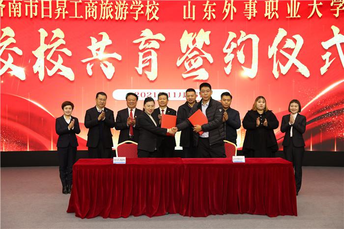 隨后,濟南市日昇工商旅游學校執行校長管玉川與山東外事職業大學產教融合辦公室主任張榮家成功簽署校校共育協議。