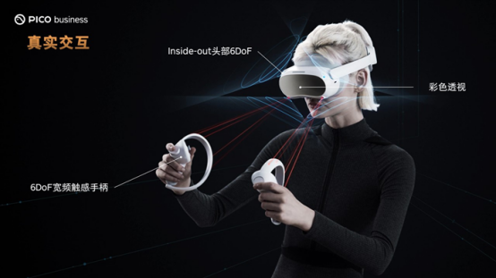 PICO 4 Enterprise憑借強大的真實交互能力,可以讓用戶能和周圍的環境產生真實的互動。它采用的6DoF空間定位配合6DoF寬頻觸感手柄,可實現亞毫米級定位精度和毫秒級追蹤速度,提供更加精準、自由與沉浸的商業互動體驗。搭載的彩色透視功能讓用戶在佩戴VR一體機時也能夠查看外部實時環境情況,提高安全性。