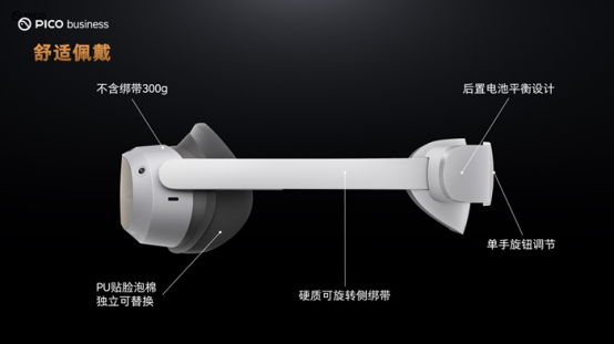 PICO 4 Enterprise采用一體化輕薄機身設計,符合人體工學,久戴也舒適。機身不含綁帶僅重300g,只比一臺常規的智能手機重一點,采用后置電池平衡設計和硬質可旋轉側綁帶,支持單手旋鈕調節,大大優化了用戶長時間佩戴的體驗。值得一提的是,PICO 4 Enterprise專為企業級用戶設計了獨立可替換的PU貼臉泡棉,相比布料的消費者版,更適合多人使用,滿足長時間佩戴的需求。