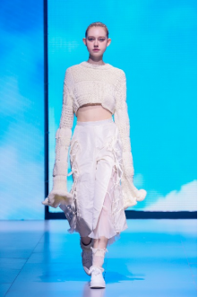 在“童年”主題秀演中,法國設計師聯(lián)袂浙江懿紗紡織科技有限公司、紹興柯橋豐旺紡織品有限公司,圍繞兒童的藝術、回到學校、童年的回憶三個子主題,共同演繹了童年的懷舊故事。設計師以精細的絎縫、印染、明線縫紉及自然著色的效果制作服裝和圖案,在工藝上采用了法國特有的編織技術,并結合WALTZ系列花紗、三醋酸、錦滌歐根紗、六角硬網(wǎng)等面料輕薄有型、色彩飽滿的特色,最大程度實現(xiàn)了紡織工藝的價值化。特別是在傳統(tǒng)手工藝非遺、生態(tài)環(huán)保材料等系列元素的加持下,為整場秀演增添了可持續(xù)時尚的價值。
