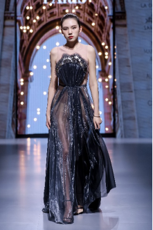 在充滿異域風情的“巴爾米拉女王”主題發(fā)布中,法國高定女裝設計師JadAdam攜手紹興永耀紡織品有限公司、紹興晶遠創(chuàng)意設計有限公司展現(xiàn)了尋找內(nèi)心平靜的啟蒙之旅的獨特過程。設計師從柯橋優(yōu)秀的面料中獲得啟發(fā),在華麗的禮服裙中采用了大量的刺繡及繡片繡珠工藝。兩家企業(yè)提供的閃光高密度歐根紗、銀色金屬絲、清透網(wǎng)眼等面料,花型立體簡潔、色彩透亮多變,為設計師帶來了豐富的靈感。從晚禮服、婚紗到高級時裝,JadAdam通過特有的藝術表現(xiàn)手法詮釋了本次禮服設計。