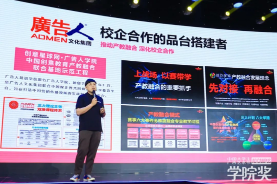 創意星球董事、副總經理李春生先生題為《做校企合作的提燈人和馬車夫》的演講。李春生先生詳細說明廣告人文化集團的歷程、內容生態圈與平臺戰略布局,表示:“廣告人文化集團發展至今,積累了深厚的社會資源。作為熱愛教育事業的追夢人,在各高校紛紛積極探索實踐教學、教育改革之路時,廣告人文化集團決心盡自己所能幫助高校在實踐教學的道路上走得更快。”