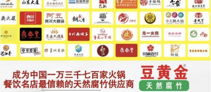 如今的豆黃金已和中國餐飲前100中的87家達成了戰略合作,銷售區域遍布全國,目前服務的終端餐飲網點超過3萬家,腐竹行業第一品牌名副其實。