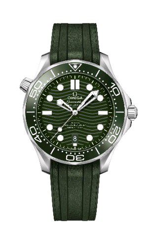 這款海馬系列300米潛水表搭配綠色波紋表盤。表殼為42毫米,采用精鋼材質打造,經拋光和拉絲處理,搭配單向旋轉拋光綠色陶瓷表圈,飾以由“大明火”工藝制成的白色琺瑯潛水刻度,12點位設有覆以Super-LumiNova夜光涂層的圓點,在暗黑環境中呈現以綠色效果。旋入式表背經拋光和拉絲工藝打磨,飾有波紋邊緣,透過藍寶石玻璃表背,可以欣賞到歐米茄8800至臻天文臺機芯的運轉美態。對于喜愛運動風格的人士而言,腕表搭配一體式綠色橡膠表帶,更便于運動佩戴。