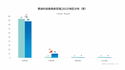 地區層面,賽迪科創獨角獸百強(2023)分布不平衡態勢依然突出,東部地區占88家,中部地區占10家、西部地區占1家,東北地區占1家,與上一年相比,中部地區增長最多,增加8家,東部地區則有所降低,但仍處于絕對領先地位。